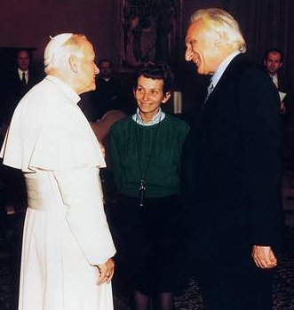 | Clicca sulla foto per vedere meglio il "sorriso forzato di circostanza" del Santo Padre (quello in bianco) e il ghigno trionfante di Kiko |